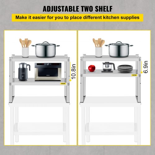 Aço inoxidável durável: Feito de aço inoxidável de qualidade alimentar, esta prateleira dupla de camada dupla de 30 "de comprimento x 11,8" de largura apresenta resistência à corrosão e estabilidade. Um complemento ideal para a sua mesa de trabalho, possui duas prateleiras para muito espaço de arrumação, cujo fundo é facilmente ajustável. Sua estrutura de aço inoxidável resistente, atraente e prática foi projetada para uso a longo prazo. Grande capacidade de carga: com armazenamento em duas camadas, esta prateleira pode ajudar a tornar o espaço da sua cozinha significativo. Ele também possui excelente capacidade de carga – a prateleira superior pode suportar cerca de 176 libras de peso e a prateleira inferior pode suportar cerca de 176 libras. Graças à sua elevada capacidade de carga, poderá guardar facilmente na prateleira dupla a maior parte dos utensílios de cozinha e preparação de que necessita todos os dias. Camada dupla ajustável: como a prateleira inferior é ajustável e a distância entre as duas prateleiras é de 6,9 a 10,8 polegadas, você pode aumentá-la ou abaixá-la para ajustá-la ao tamanho dos itens que deseja armazenar. O design de dois andares pode adicionar capacidade extra à mesa de trabalho da sua cozinha. Além disso, o maior espaço de armazenamento é conveniente para você organizar seus utensílios de cozinha e preparação usados com frequência. mostre mais
