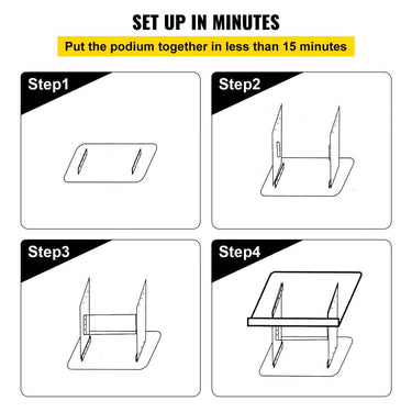 A montagem do pódio é fácil e rápida, sendo composto por uma placa superior, duas paredes laterais, uma placa fixa e um rodapé. Um guia detalhado e ferragens são fornecidos para facilitar a montagem e desmontagem em questão de minutos.
