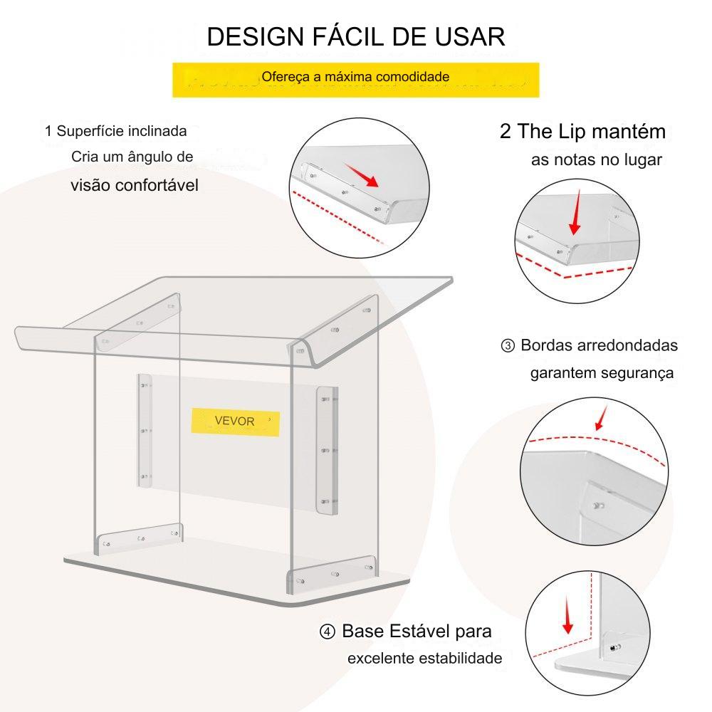 Fabricado com material de acrílico espessado, este pódio transparente se destaca por sua alta resistência a impactos e durabilidade. A placa superior tem uma espessura de 0,31 polegadas / 8 mm, enquanto as paredes laterais possuem 0,59 polegadas / 15 mm. Além disso, o pódio possui bordas arredondadas para garantir a segurança durante o uso e apresenta um design elegante e moderno.