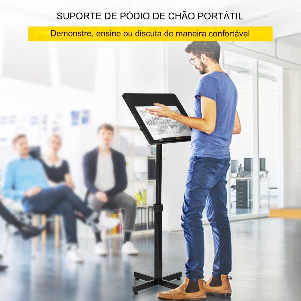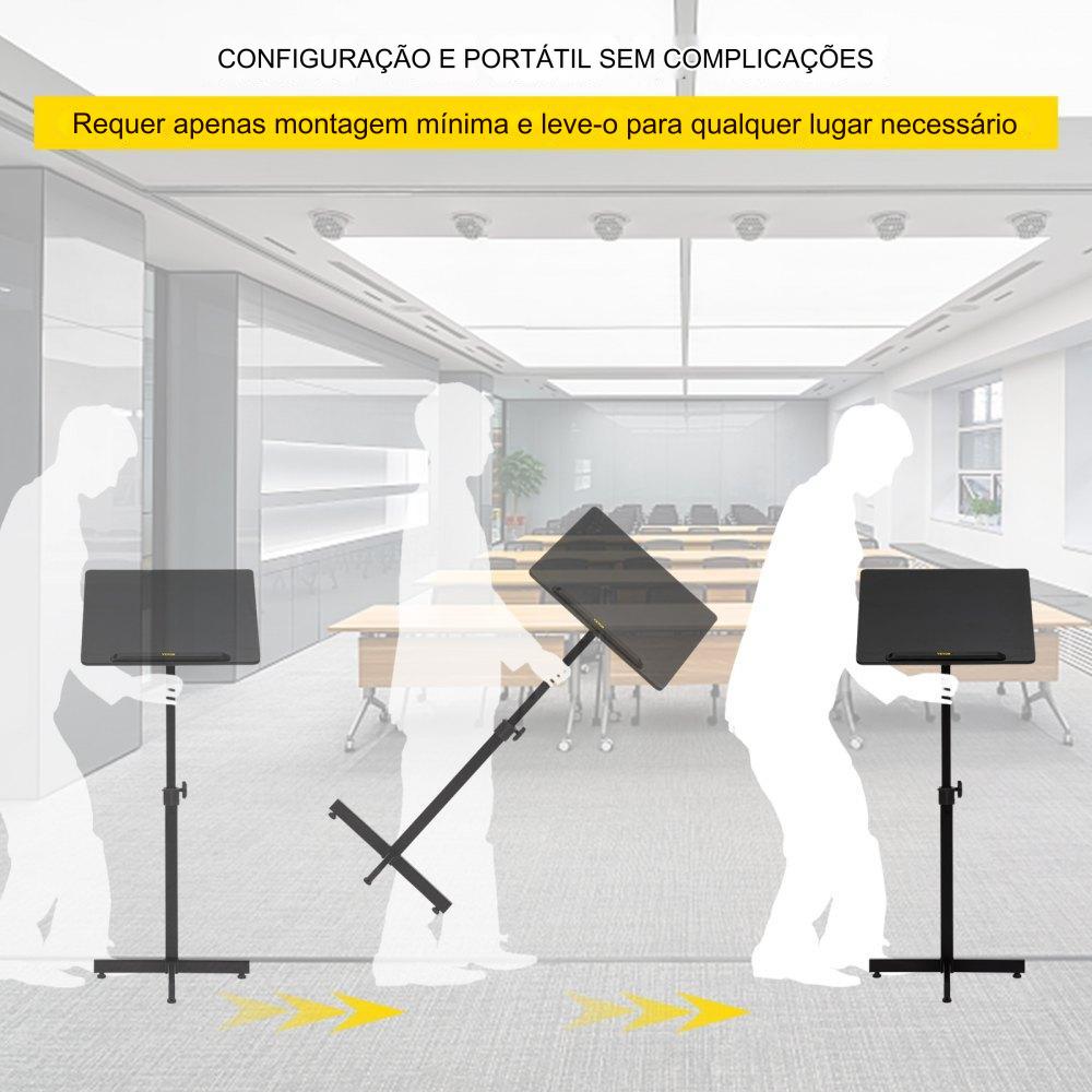 O suporte de mesa portátil é um recurso versátil que pode ser utilizado em diversas situações, como em palestras, apresentações de alunos, salas de aula, salas de leitura, entre outros. Sua altura é ajustável, variando entre 76,5 e 109 cm, o que o torna adequado para pessoas com altura entre 140 cm e 190 cm. O ajuste de altura é feito através de um botão de fácil manuseio, garantindo uma posição precisa e confortável durante as apresentações.