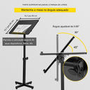 Principais características: A mesa possui dimensões de 50 x 40 cm e pode ser inclinada em um ângulo de 0 a 90°. Quando inclinada a 90°, facilita o armazenamento. Já a inclinação de 45° permite que o suporte seja utilizado como um atril em salas de aula, concertos e igrejas. Caso a inclinação seja de 0°, o suporte pode ser utilizado como uma mesa convencional. Além disso, a borda de 33 cm no topo ajuda a manter dispositivos eletrônicos, materiais de ensino e livros no lugar.