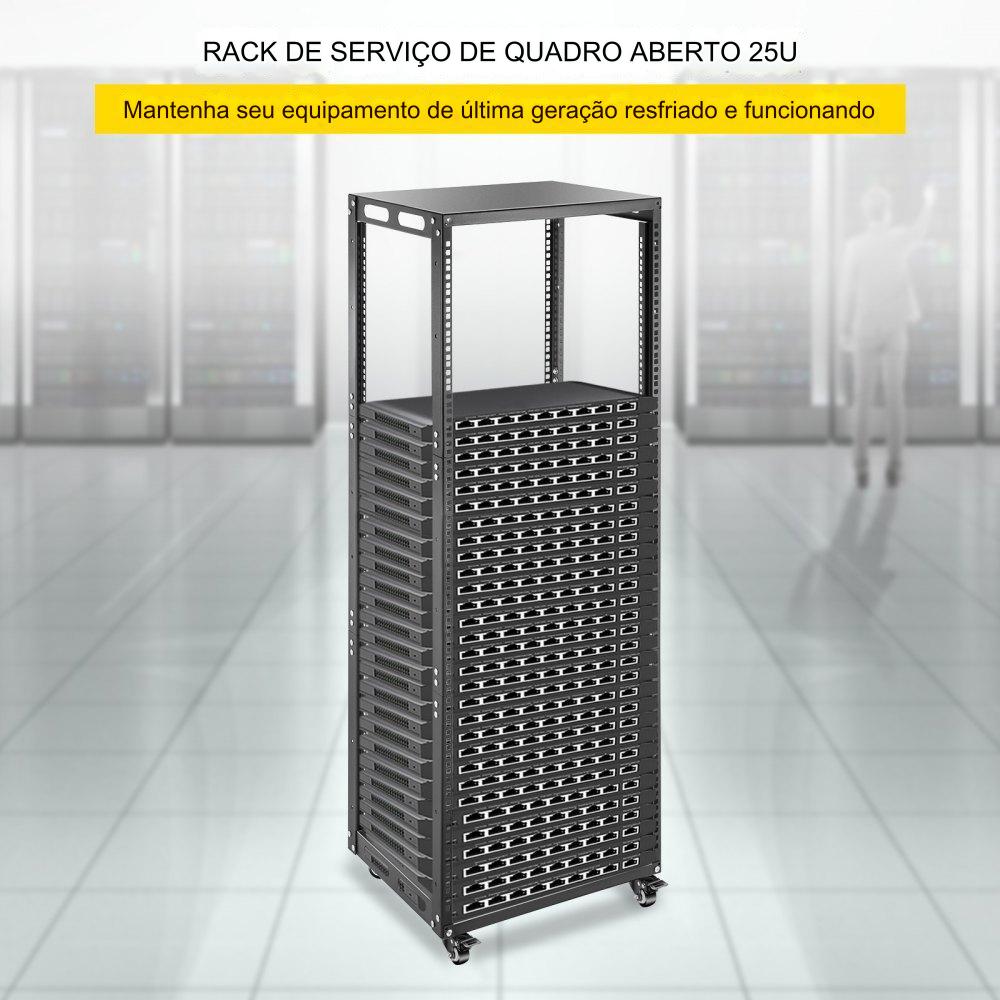 Uma das principais vantagens deste rack é a sua estrutura aberta, que simplifica o acesso e a manutenção dos equipamentos. Não há necessidade de desbloquear portas ou remover paredes laterais para acessar o equipamento, o que torna a manutenção e a fiação muito mais acessíveis.