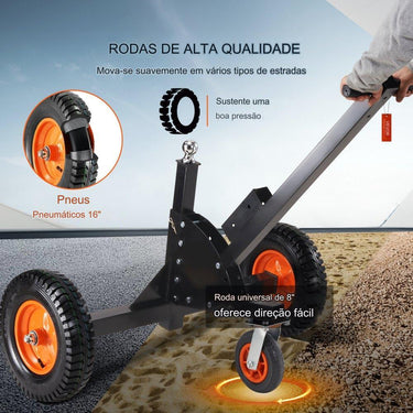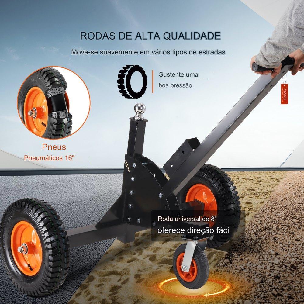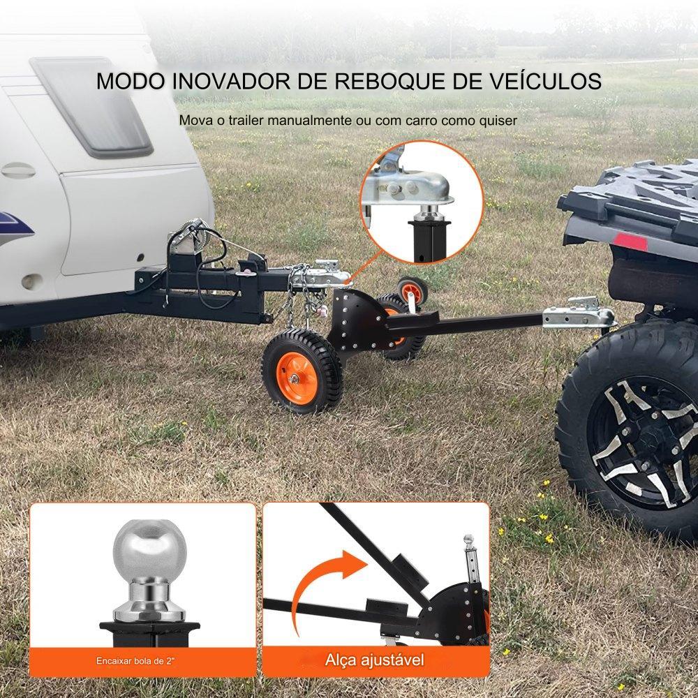 Capacidade de carga máxima: 680,4 kg (1500 lbs); Carga máxima de reboque: 6804 kg (15000 lbs); Diâmetro da esfera: 50.8mm (2 polegadas); Tamanho da embreagem: 50.8mm (2 polegadas); Altura ajustável da bola da embreagem: 60-90 cm (23,6-35,4 polegadas); Material: aço carbono e borracha; Diâmetro do pneu: 40,6 cm (16 polegadas); Diâmetro universal da roda: 20,3 cm (8 polegadas); largura entre eixos: 108 cm (42,5 polegadas); Dimensões do produto (modo de tração manual): 127 x 109 x 83,5 cm (50 x 42,9 x 32,9 polegadas); Dimensões do produto (modo de trem do veículo): 138 x 109 x 83,5 cm (54,3 x 42,9 x 32,9 polegadas); Peso do produto: 30,5 kg (67,2 lbs); Manual: Link para download;