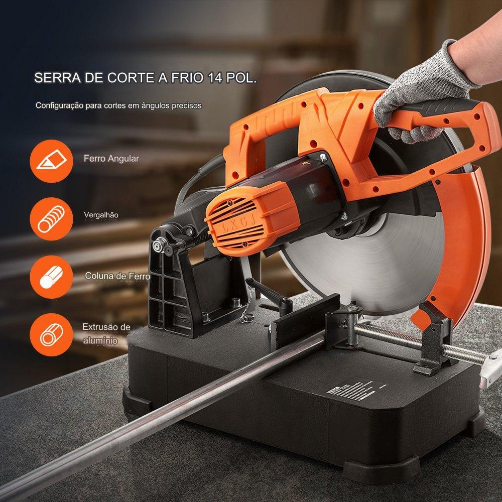 Peso bruto: 59 lbs / 26,7 kg; Material da lâmina de serra: liga cerâmica de aço inoxidável; Tecnologia de corte: corte a seco; Faixa de corte: barras de aço, vergalhões de aço, ferro-angular, alumínio, etc; Indicações de uso: canteiros de obras, salas de produção, indústria de decoração, etc; Recomendações de segurança: proteção contra faíscas, partida suave; Especificações elétricas: voltagem AC 220 V 50 Hz, potência nominal 2800 W, velocidade de marcha lenta 1200 rpm; Dimensões do produto: 18,62 x 12,59 x 28,54 polegadas / 47,3 × 32 × 72,5 cm; Número do modelo do artigo: J1G-ZB-355G-3