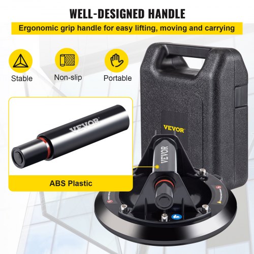 Capacidade de carga de 100kg: Este levantador de sucção portátil possui uma ventosa plana de 8". Pode puxar cargas de até 100 kg. Portanto, é muito fácil arrastar e levantar o objeto de superfície lisa. Materiais de alta qualidade: O levantador de sucção manual é feito de borracha durável, inodora e extra forte e possui uma alça robusta para uma fixação sólida e ergonômica. Indicador de linha vermelha: O indicador vermelho avisa o usuário sobre perda de vácuo; a ventosa antiderrapante pode manter a sucção por muito tempo para evitar acidentes. Design científico da alça: A alça ergonomicamente projetada é perfeita para levantar, mover e transportar. É antiderrapante, portátil e muito estável durante o trabalho. Ampla aplicação: O vácuo de elevação de vidro é compatível com superfícies lisas e não porosas, como mármore, azulejos, pedra, granito, espelhos, vidro, plástico, metal, etc.