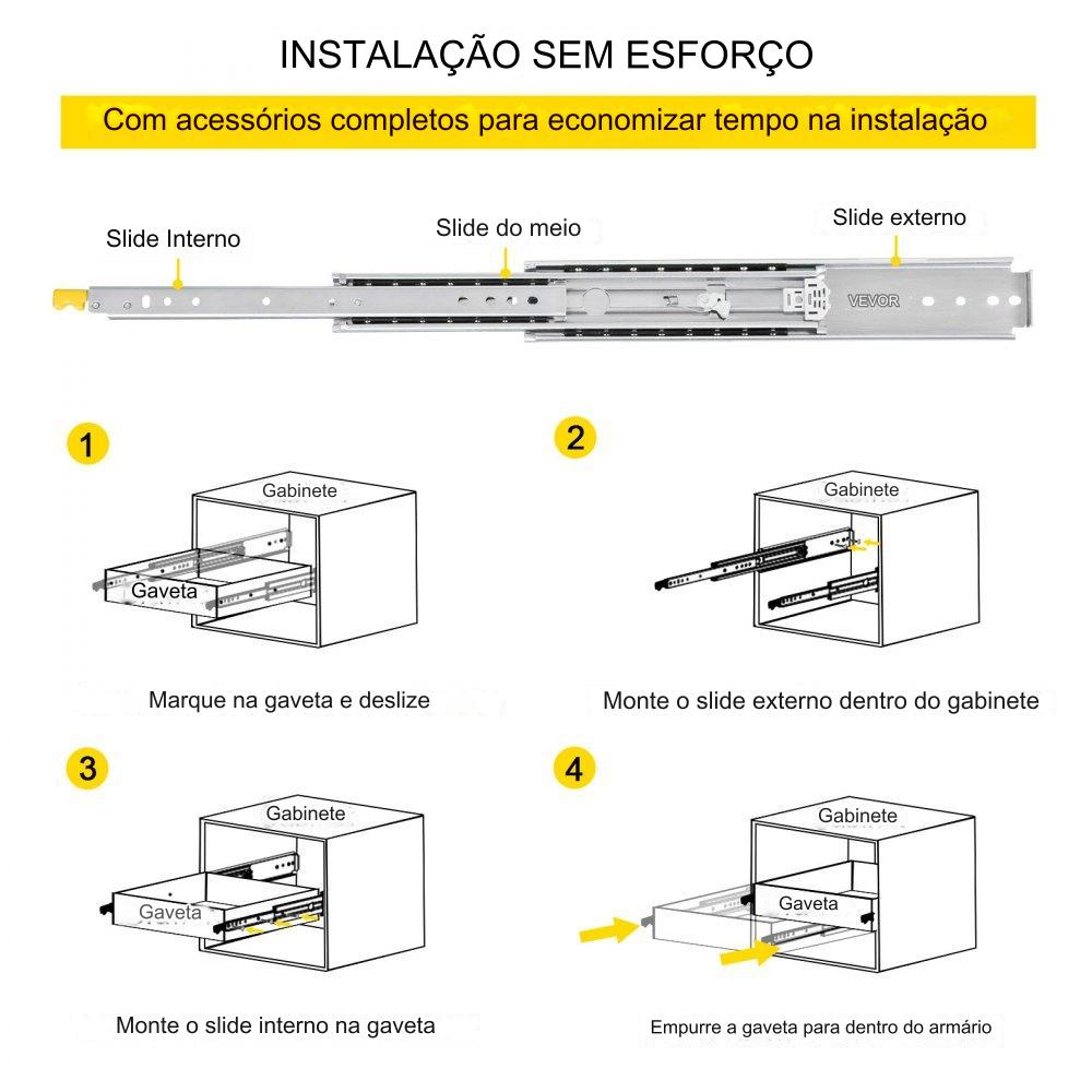 É importante escolher o tamanho correto das guias para sua gaveta. Elas são compatíveis com a maioria dos tipos de gavetas e armários. Para determinar o tamanho certo, é recomendado medir o comprimento da gaveta e do armário sem a guarnição antes de adquirir as guias de extensão. Vale ressaltar que o comprimento das guias não deve ser menor ou igual à profundidade da gaveta.