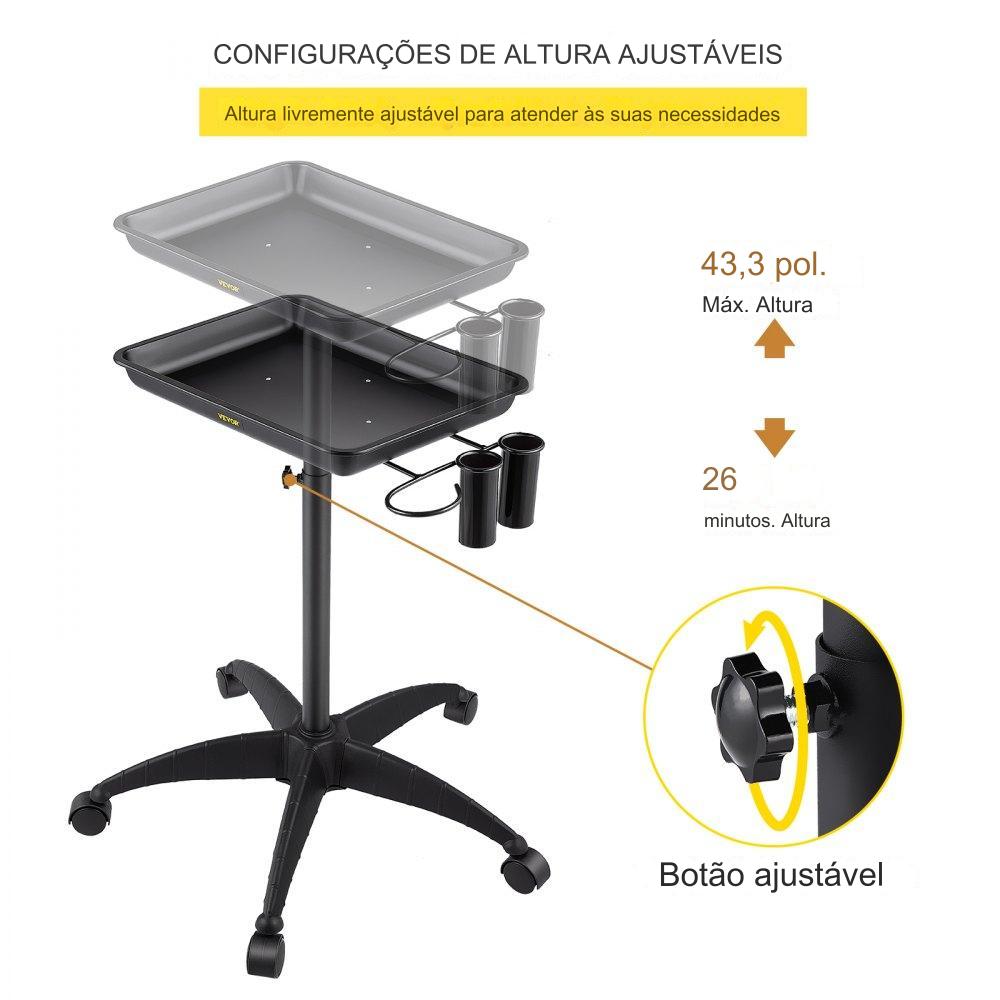 A altura da bandeja é ajustável individualmente, permitindo ao usuário ajustá-la entre 66 cm e 110 cm. Isso possibilita adaptar a altura de acordo com diferentes tamanhos de corpo, contribuindo para o conforto e bem-estar do profissional.