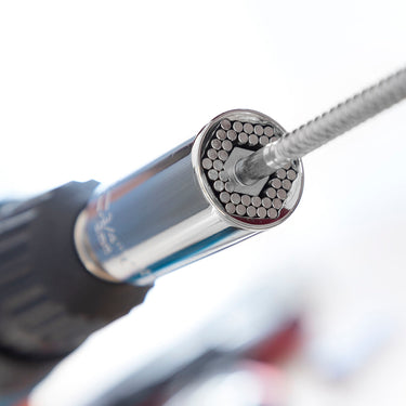 Uma inovadora e versátil chave de soquete universal com acessórios que permite aparafusar e desaparafusar facilmente qualquer tipo de porca, parafuso, perno, gancho, etc. Adapta-se a qualquer tamanho e forma dentro das suas dimensões, pelo que é apta para parafusos entre 7-19 mm. O acessório de conexão universal incluído permite a introdução de qualquer catraca, berbequim ou aparafusador elétrico ou manual com pontas intercambiáveis. Inclui um acessório extensor para aumentar o seu alcance e um acessório cotovelo com inclinação de 105° para zonas de difícil acesso ou com pouco espaço. É fabricada com metais de grande qualidade e resistência e é muito fácil de utilizar, transportar e guardar. Esta original e prática ferramenta compacta e ligeira evita que tenha de carregar pesadas maletas ou caixas com uma diversidade de chaves para diferentes tamanhos e tipos de parafusos.