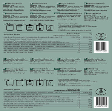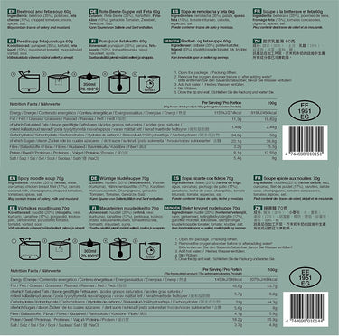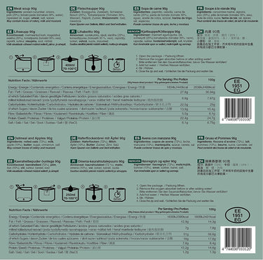 - 3 refeições de pequeno-almoço completas e embaladas individualmente e 3 sopas nutritivas e saborosas, ambas com validade até 8 anos.