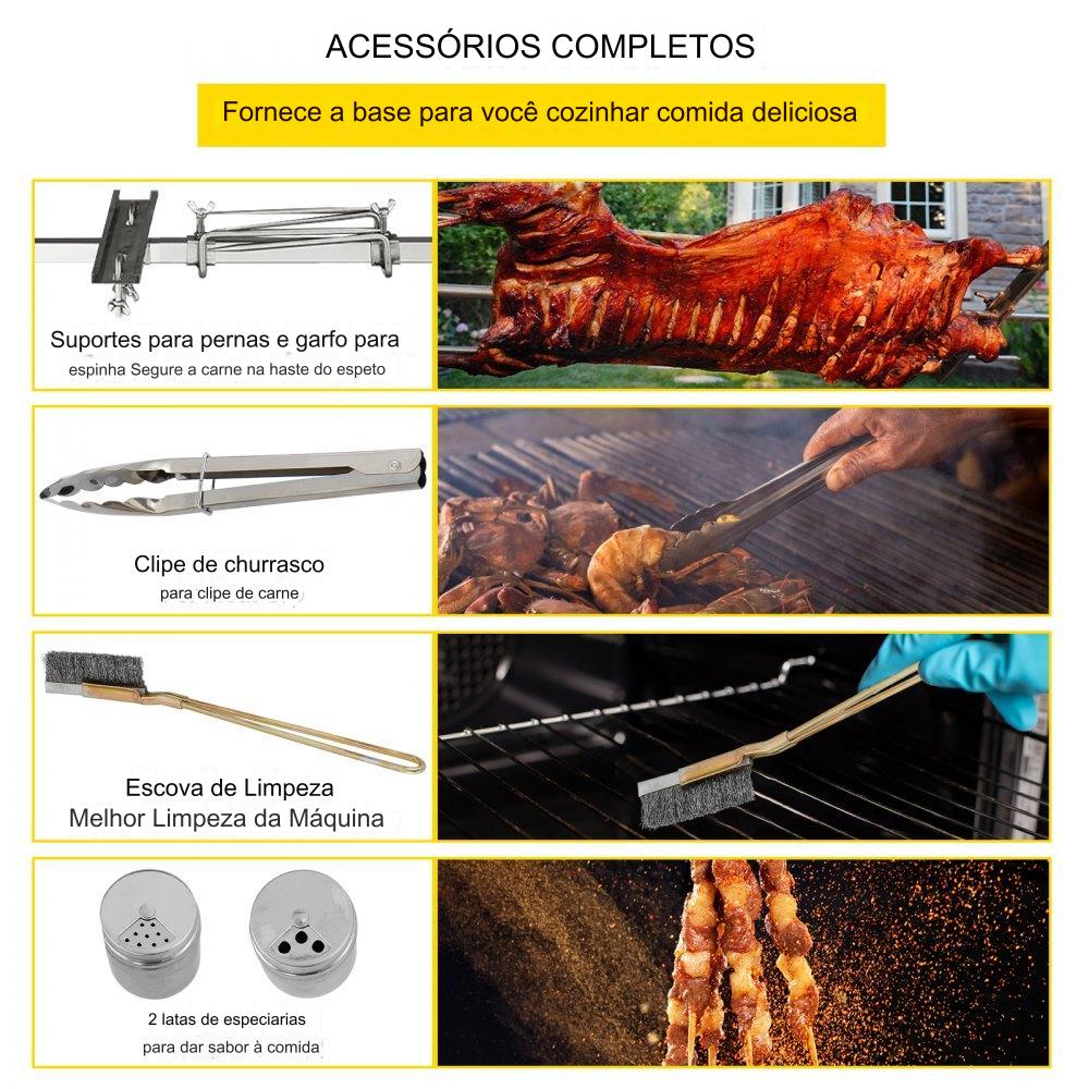 O espeto de cordeiro é fabricado em aço inoxidável durável e de alta qualidade, o que o torna resistente a altas temperaturas e fácil de limpar. Possui três grelhadores de aço inoxidável que proporcionam um melhor cozimento dos alimentos. A churrasqueira tem capacidade máxima de carga de 132 lbs (60 kg) e conta com motores de alta intensidade que auxiliam no grelhamento de forma mais eficiente.