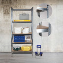Esta unidade de prateleiras possui prateleiras em MDF suportadas por uma estrutura de aço e é fácil de montar. As prateleiras são ajustáveis em altura e cada uma delas dispõe de uma capacidade de carga máxima de 75 kg, atribuindo à unidade de prateleiras uma capacidade de carga total de 375 kg. As protecções para os pés protegem o chão de riscos e proporcionam uma estabilidade adicional.