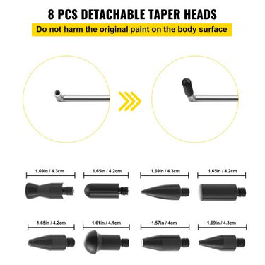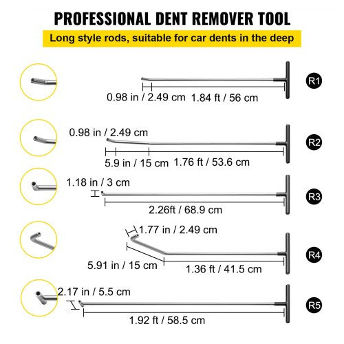 O que os kits podem fazer: Com as 5 prensas dentadas estilo R sem pintura, você pode consertar seu carro facilmente sem danificar a pintura original de sua carroceria. O conjunto de remoção de amolgadelas é ideal para remover amolgadelas de forma eficiente e segura. Também é adequado para superfícies metálicas como carros, geladeiras, motocicletas e máquinas de lavar. Hastes dentadas de 5 peças: inclui hastes dentadas de 5 peças em tamanhos diferentes (R1-R5). Este conjunto de postes é um dos postes longos com ponta redonda. A faixa de comprimento está entre 1,36 pés (41,45 cm) e 2,26 pés (68,88 cm). O alicate ergonomicamente projetado economiza trabalho, é fácil de levantar e é adequado para amolgadelas profundas que não podem ser alcançadas com as mãos. Aplicação: Com a placa refletora de luz, você pode detectar a deformação a ser reparada. Selecione a ferramenta de remoção de mossas em formato de ponta mais adequada. Mova o amassado de dentro ou de baixo do painel para fora. Use um martelo de borracha para reparar superfícies irregulares. mostre mais