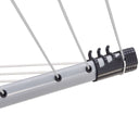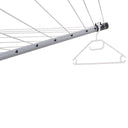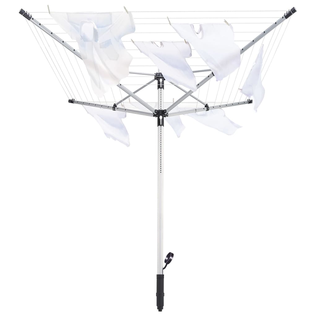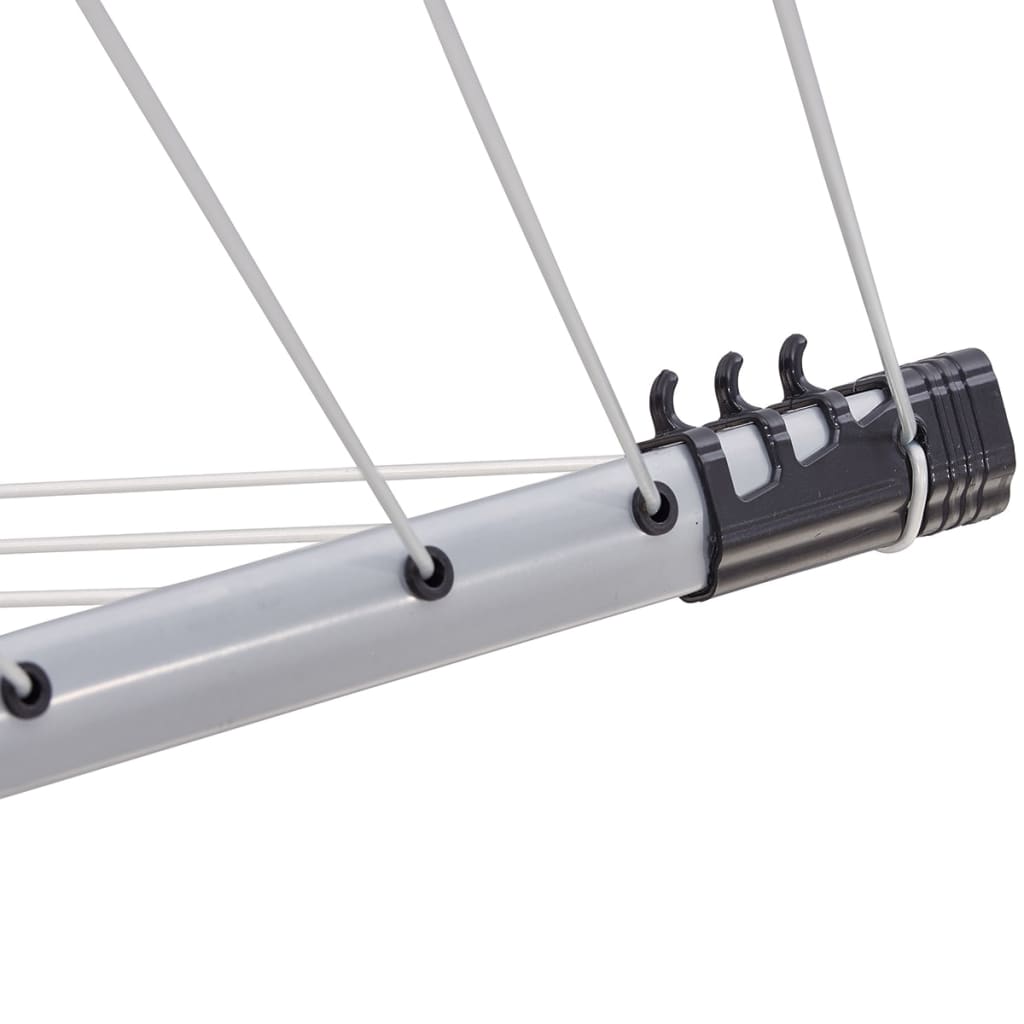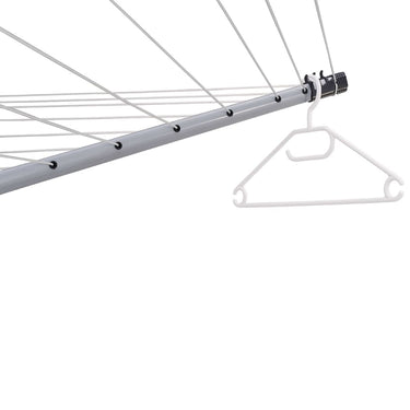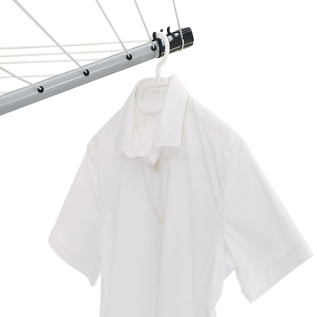 O estendal estilo guarda-chuva tem espaço para cinco máquinas/cargas de roupa e está pronto para ser utilizado com apenas um movimento. Os quatro braços do estendal podem ser abertos sem esforço e sem que as linhas fiquem emaranhadas, graças ao sofisticado sistema de abertura. A altura da linha pode variar opcionalmente entre 1,35 e 1,8 metros. Os quatro braços rotativos possuem um total de 12 ganchos para cabides, oferecendo um espaço adicional para secagem rápida e sem vincos de blusas, camisas e t-shirts. Os braços de suporte em aço e um poste central sólido garantem ao estendal resistência, mesmo quando totalmente carregado com roupa.
