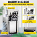 3 sabores opcionais e 2 funis: A sorveteira comercial VEVOR é capaz de produzir até 5 gal (18 L) de sorvete a cada hora e cerca de 10 unidades por vez. Está equipada com dois 0,8 gal (3 L) equipados com funis, ambos feitos de aço inoxidável 304 de qualidade alimentar. E 3 sabores são construídos em nossa máquina de sorvete para satisfazer diferentes gostos, incluindo 2 sabores únicos e 1 sabor misto. Você pode adicionar diferentes sabores ao sorvete, como baunilha, morango, chocolate, manga, etc.