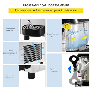 Com um design cuidadoso, a máquina possui grandes aberturas de ventilação para dissipação confiável de calor, pés antiderrapantes para maior estabilidade e uma alça de mola que facilita a operação. Além disso, a bandeja de gotejamento removível evita derramamentos da bebida. Portanto, você pode aproveitar o verão quente com um refrescante slushie sem preocupações.