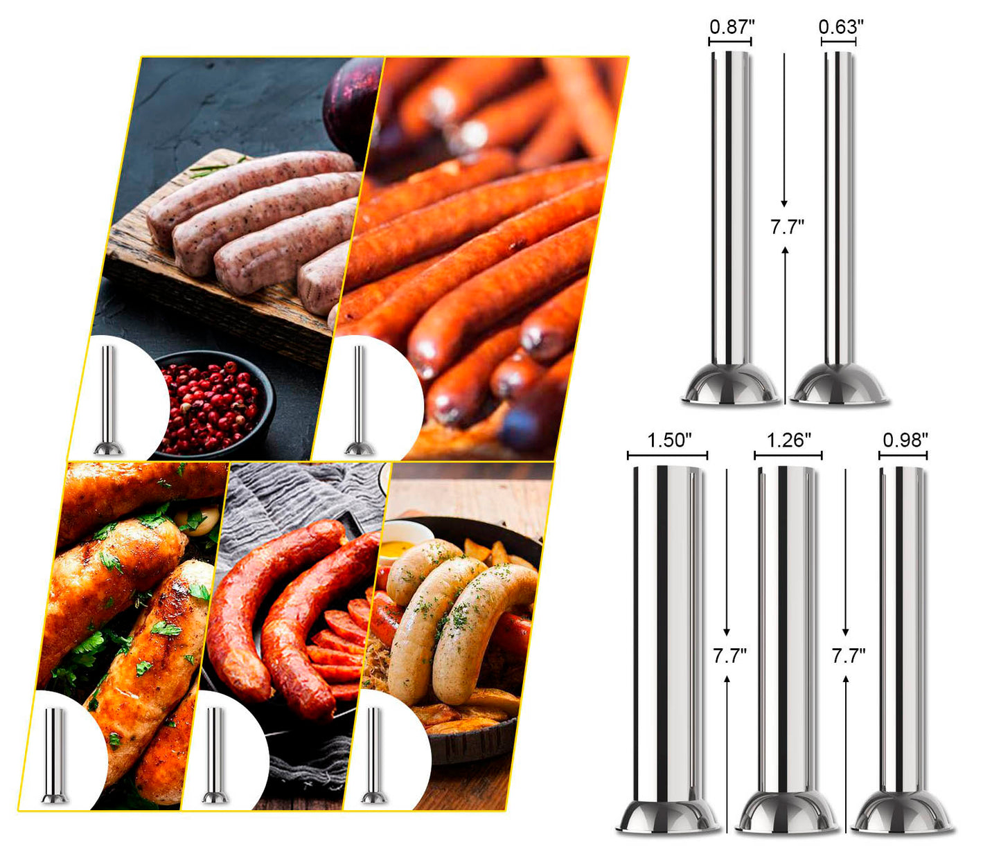- Tubos de enchimento múltiplo: vem com cinco tubos de enchimento de aço inoxidável ( Φ16mm , Φ22mm, Φ25mm, Φ32mm, Φ38mm), que podem atender a diferentes necessidades de tamanho, ótimos para fazer salsicha, cachorro-quente, churro, snack stick, muito adequado para uso comercial e privado usar.