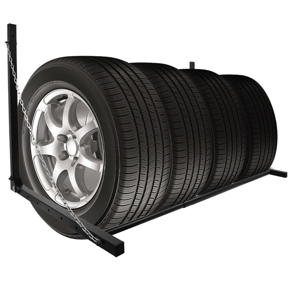 Feita de aço revestido a pó resistente e durável, esta estante para pneus fácil de instalar suporta até 90 kg. A largura é ajustável entre 90 e 130 cm (com um comprimento efetivo de 122 cm).
