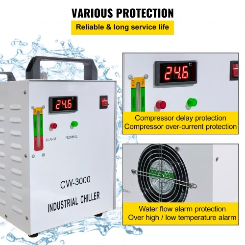 Parâmetros do produto: O resfriador de água industrial CW-3000AG tem capacidade de 9L, fluxo máximo de 12L/min, resfriamento de 50W/℃, tensão de 220V, frequência de 50Hz e corrente de 0,45A. Ventilador de resfriamento eficiente: O refrigerador de água industrial possui um radiador profissional resfriado a ar, que possui forte capacidade de dissipação de calor e não é facilmente bloqueado. Um ventilador interno de alta velocidade dissipa rapidamente o calor. Termostato preciso: Equipado com controle preciso de temperatura, o monitoramento de temperatura em tempo real garante que você possa monitorar com precisão o status operacional do resfriador. Várias funções de alarme: Este refrigerador de água industrial possui vários mecanismos de proteção de aviso, como proteção de alarme de fluxo de água, alarme de temperatura alta/baixa. Aplicação múltipla: O resfriador de água industrial profissional CW-3000 é adequado para pequenos equipamentos de resfriamento de água. Possui certificado de patente, certificado CE e ROHS e é projetado para resfriar o tubo de laser de vidro CO2 da máquina de gravação e corte a laser abaixo de 60W/80W. mostre mais
