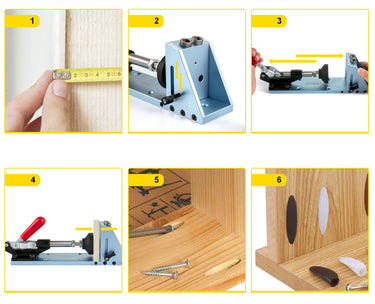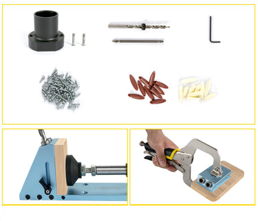 Operação simples : Cada kit de gabarito de furo de bolso possui um botão de profundidade de perfuração conveniente para ajustar rapidamente a espessura da madeira, o que pode evitar danos, lascas ou rachaduras. O furo do guia de broca é projetado com um ângulo apropriado de 15 graus para minimizar o tamanho do furo com efeito notável.