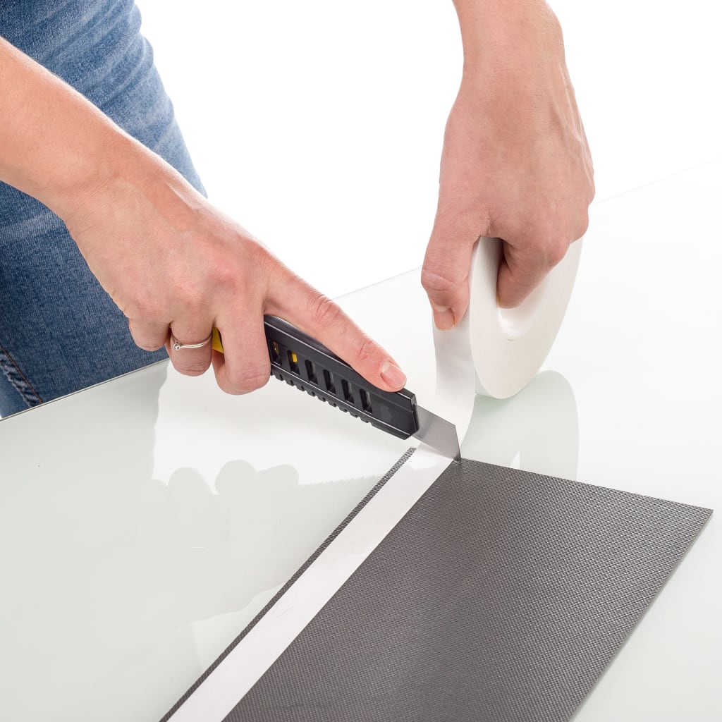 Pode colar a fita adesiva facilmente na parte de trás das tábuas, retirar a tira e colar as tábuas na parede. Um rolo é suficiente para uma embalagem de 15 tábuas. Esta fita adesiva, com elástico durável e alta resistência à tração, consegue aderir à maioria das superfícies não porosas.