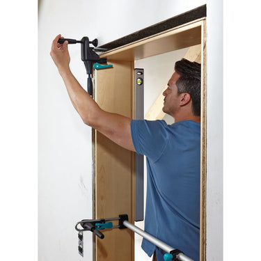 Este conjunto de ferramentas para montagem de moldura de porta PRO, da Wolfcraft, irá ajudá-lo a ajustar e a alinhar perfeitamente uma moldura de porta em apenas alguns passos.
