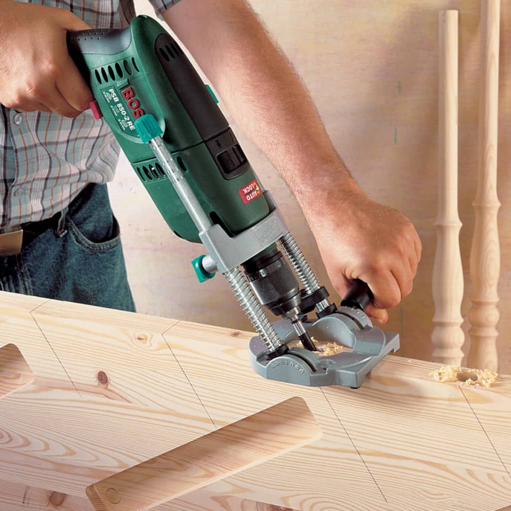 Este suporte é adequado para todos os berbequins elétricos de 43 mm. Graças ao conector para a extração de pó, permite uma perfuração livre de pó e precisa em todas as posições. O suporte de berbequim possui barras guia duplas inclináveis com escala para uma perfuração precisa de +/- 45°. Está equipado com uma pega adicional para uma colocação precisa e contra deslizamentos durante a perfuração. A ranhura em V integrada foi concebida para fixar as peças redondas com segurança.